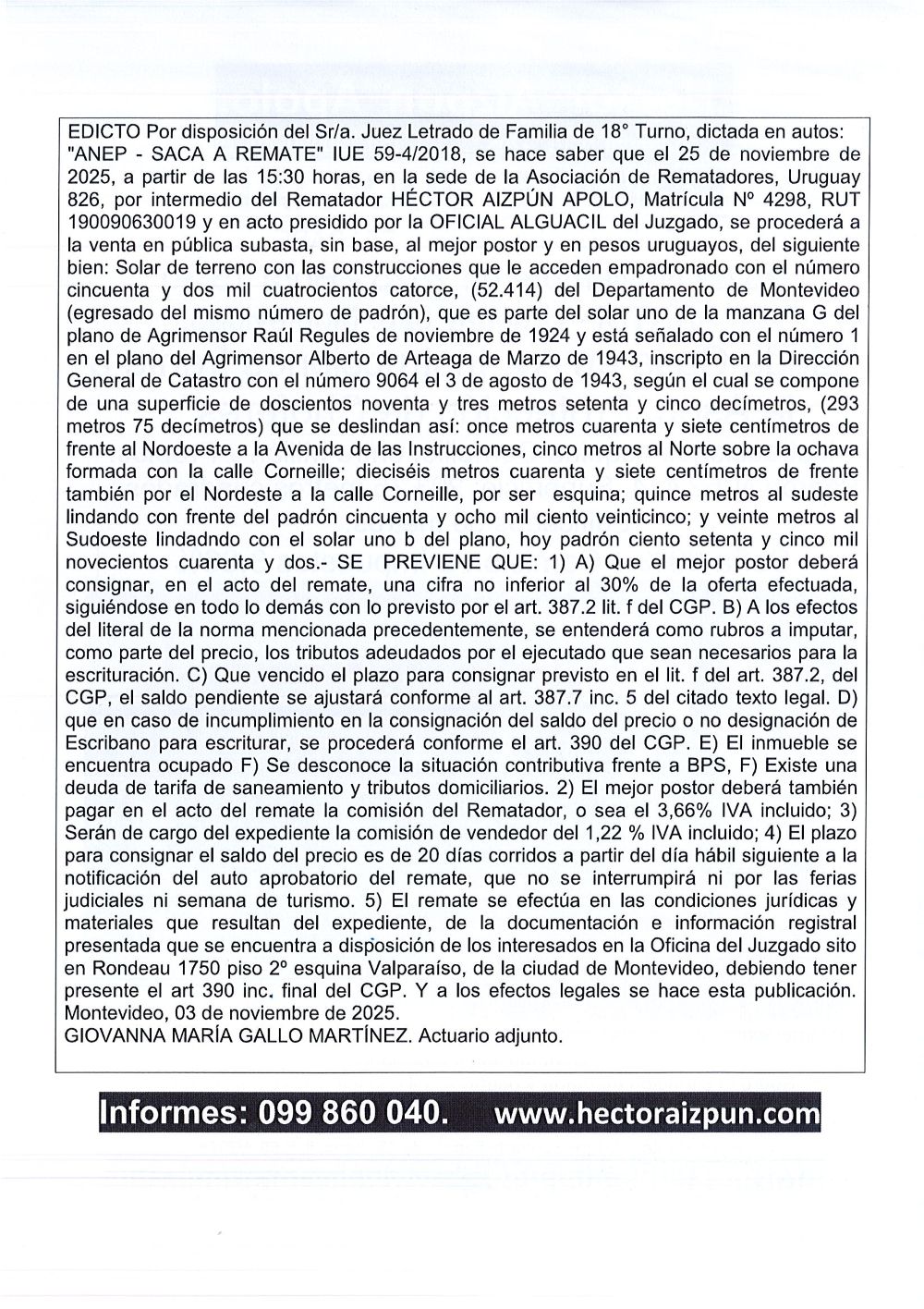 Direccion remate: ANRTCI Av. Uruguay 826, Montevideo