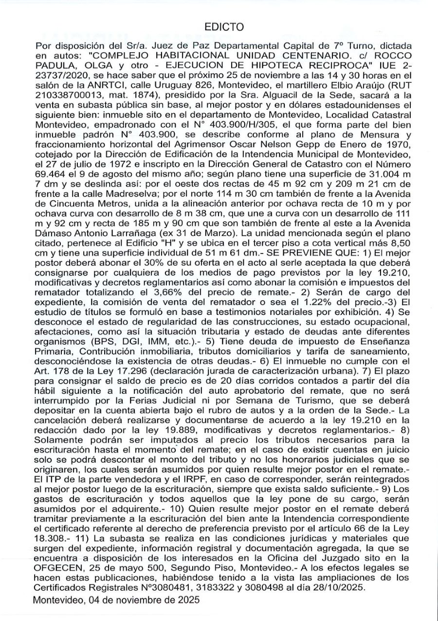 Direccion remate: ANRTCI Av. Uruguay 826, Montevideo