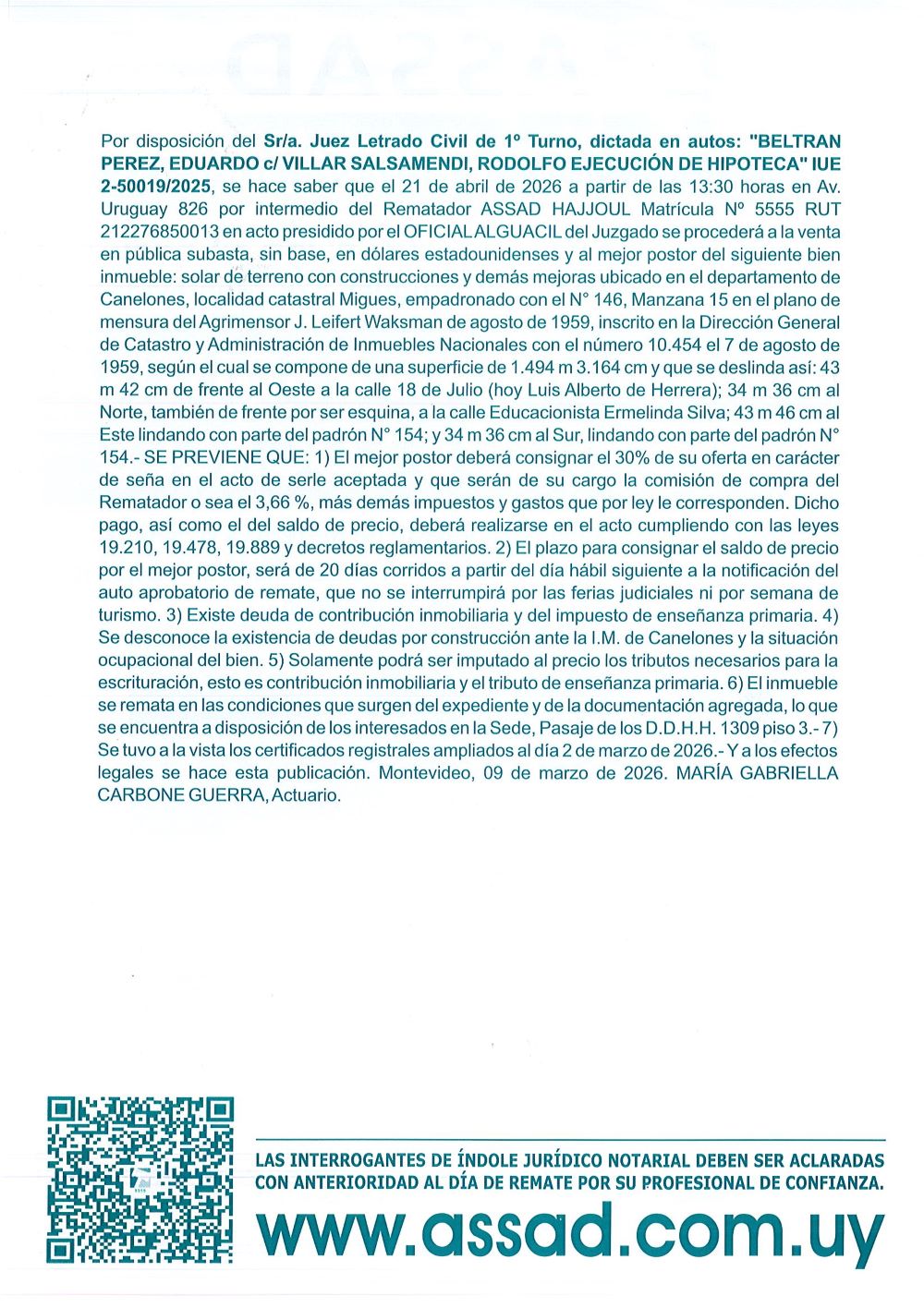 Direccion remate: ANRTCI - Av. Uruguay 826, Montevideo